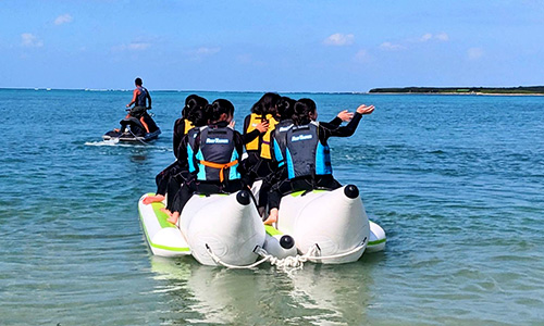 マリンジェットで牽引する乗り物の「バナナボート」で、水面を駆け抜けて爽快感や不安定な水面などの、普段体験することができない感覚を経験。