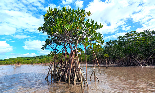 マングローブ林の喫水域を散策しながら、亜熱帯地域固有の動植物を観察する自然体験学習。世界一周達成講話